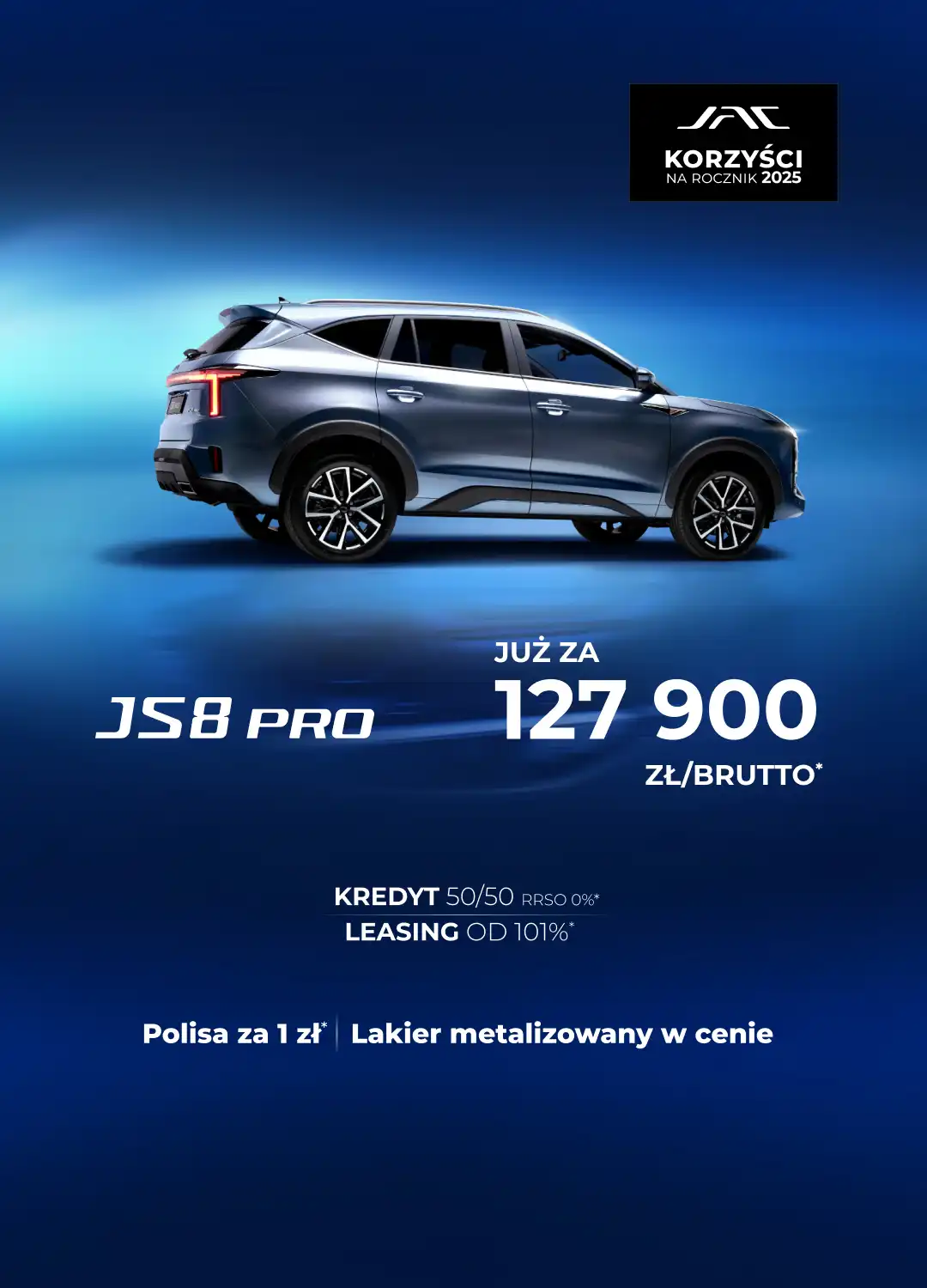 4. Propozycja dostępna do 31.03.2026 r. Suma opłat leasingowych wynosi od 101,01% ceny pojazdu na określonych warunkach i zależy w szczególności od wpłaty własnej, okresu leasingu, zmian stawki WIBOR 1M oraz wartości wykupu. Przyznanie finansowania zależy od wyniku badania zdolności ubiegającego się o finansowanie do jego spłaty. Propozycja nie stanowi oferty i jest adresowana wyłącznie do przedsiębiorców. Podmiotem finansującym jest BNP Paribas Leasing Services Sp. z o.o. z siedzibą w Warszawie. Dotyczy modelu JS8 PRO z roku produkcji 2025. Szczegóły u dealerów marki JAC.